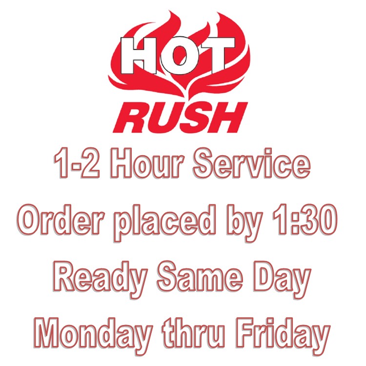 HOT Rush: Orders placed by 1:30pm EST will be ready by 4pm on the same business day for customer pick up or shipping. HOT Rush Orders placed after 1:30 pm will be ready the following morning, by 10 am